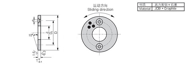 基本特性 JTW自润滑止推垫片,结合了铜合金(ZCuZn24Al6)的耐磨性及固体润滑剂的自润滑性能,使其在使用过程中无需加油维护。产品被广泛用于高载、间歇性或摇摆运动,如汽机车生产流水线、水轮机、水库工作/事故门、塑胶机械等。根据使用的工况,可以提供各种类型的铜合金。